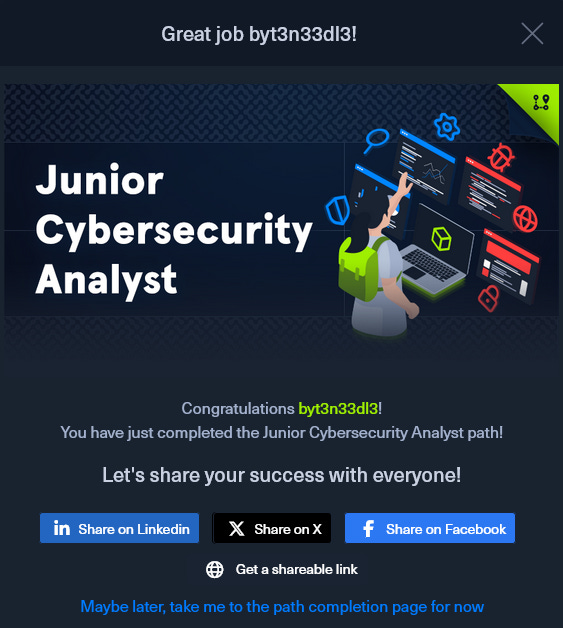 For anyone wondering if the path is “worth it,” I can say without hesitation that it is. The skills I’ve gained have already made me more effective, versatile, and confident as a cybersecurity professional. The structured progression ensures you don’t have knowledge gaps, and the gamified, achievement-driven environment keeps you motivated from start to finish. However!….. again, this title has “Junior“ in it, so I would only suggesting this for anyone who haven’t had role path like Red Teamer, or Blue Teamer, I would still suggest CPTS is greater in a way of proofing ground.