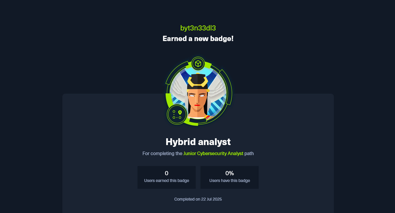 One of the most valuable aspects of the CJCA path is its balance between theory and hands-on labs. Every module pushes you to apply concepts in practical scenarios, simulating real-world attacks, defenses, and investigations. This isn’t passive learning; it’s active skill-building that prepares you to handle incidents, analyze logs, and think like both a blue teamer and a red teamer. The hybrid analyst badge is proof that this path forges both skillsets simultaneously.